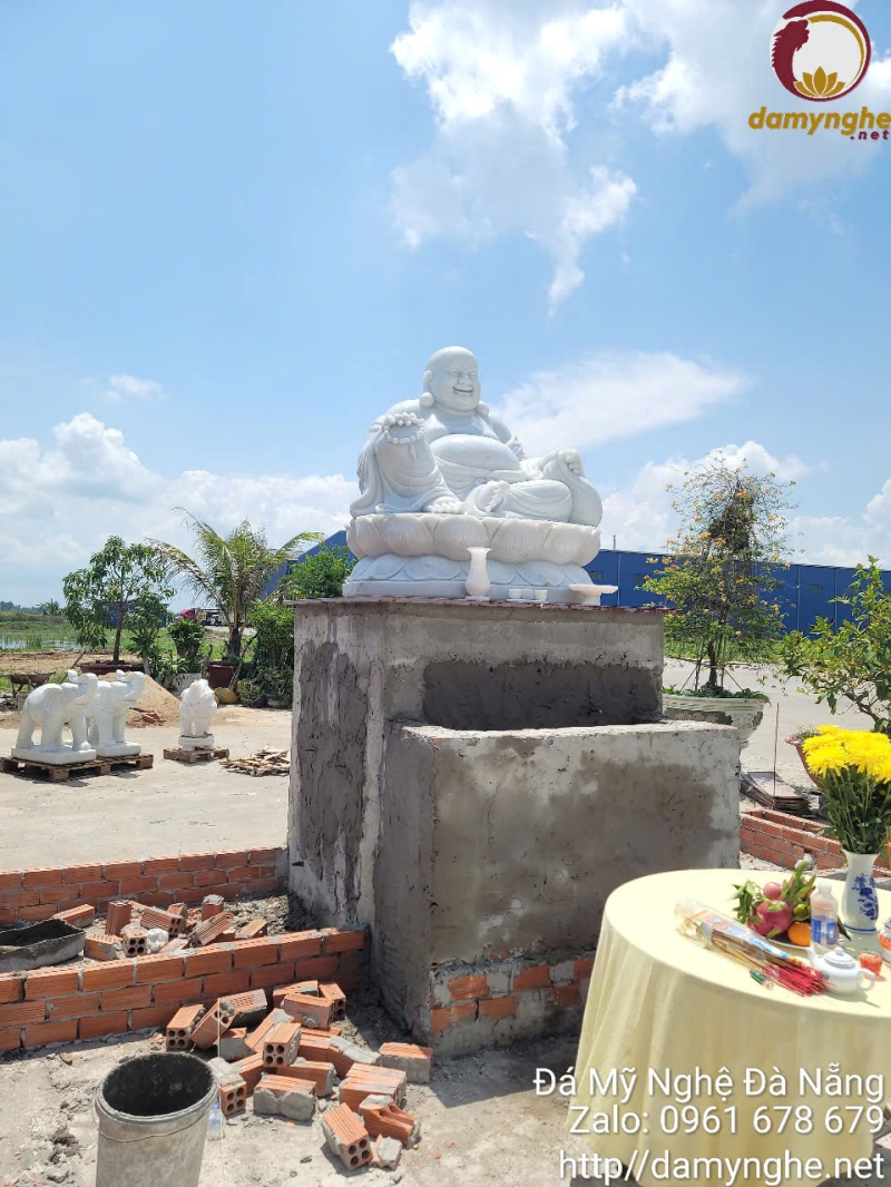 Tượng Di Lặc được điêu khắc từ đá trắng tự nhiên cao cấp, bề mặt mịn, thần thái tươi vui, phù hợp cả về tâm linh lẫn phong thủy.