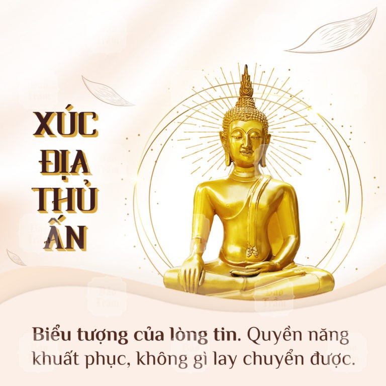 Đức phật có tư thế xúc địa thủ ấn luôn được mô tả trong tư thế ngồi kiết già hoặc bán già, với bàn tay trái đặt trên đùi, lòng bàn tay hướng lên trên như trong ấn Thiền Định còn tay phải duỗi xuống, lòng bàn tay xoay vào trong, mu bàn tay đưa ra ngoài, các ngón tay hướng xuống đất. Thủ ấn này dựa theo sự tích ghi trong Chú giải Phật sử. Khi Ngài ngồi hành thiền trong đêm rằm tháng Vesak, Ma Vươngxuất hiện quấy nhiễu Ngài.Đức Phật từ tư thế thiền định, đặt bàn tay phải chạm đất và tuyên bố: “Mặt đất này là chứng nhân, đã chứng kiến qua nhiều kiếp, ta đã hoàn thiện hạnh Bố thí Ba La Mật, hạnh Trì giới Ba La Mật, và các Ba La Mật khác.” Ngay lúc đó, mặt đất rung chuyển, với âm thanh vang dội khắp vũ trụ. Ma vương run sợ, thất bại, và rút lui.